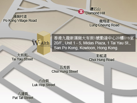 San Po Kong - The Wealth Business Centre 20/F., Unit 1 - 5, Midas Plaza, 1 Tai Yau St., San Po Kong, Kowloon, Hong Kong. Click Here to view Google Map Tel.: 852 - 3966 2888 Fax: 852 - 3966 2666 Email: info@the-wealth.com.hk Opening Hours Monday - Friday: 9:00am - 6:00pm Saturday, Sunday and Public Holiday: OFF |