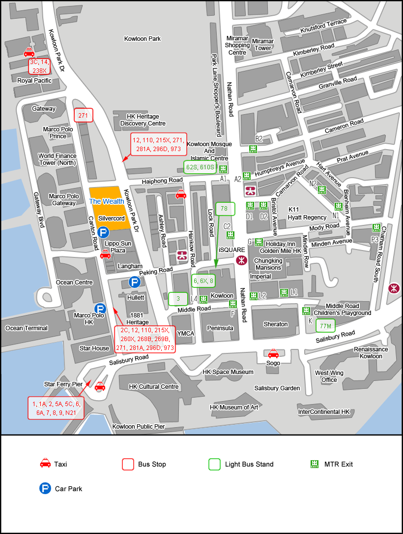 Silvercord centre is located at the heart of Tsimshatsui, close to Tsimshatsui MTR Station, Star Ferry and the China Hong Kong City Terminal, with a myriad of bus and mini-bus routes offering convenient access to everywhere, whether it is Hong Kong island, Kowloon and the New Territories, Hong Kong International Airport or to depart for the Mainland or various places around the world.
